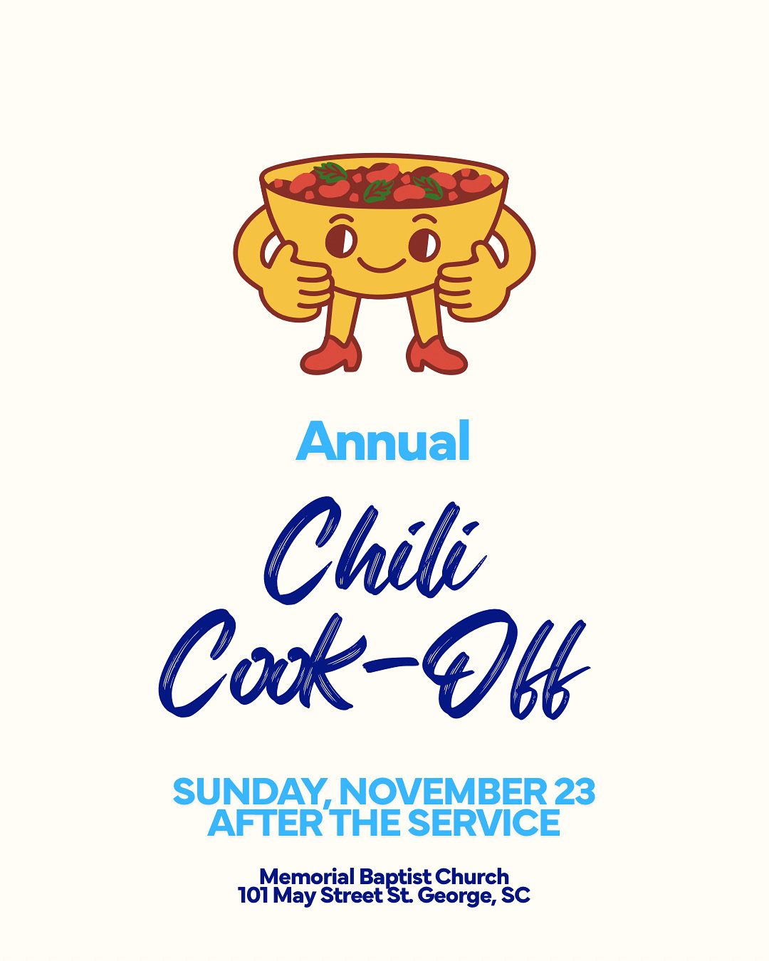 After the service, compete in our annual Chili-Cook Off. Please drop off your chili in the fellowship hall before MBC/ Sunday School groups. It will be judged before the luncheon. If you don’t want to bring chili, feel free to bring corn bread to share.