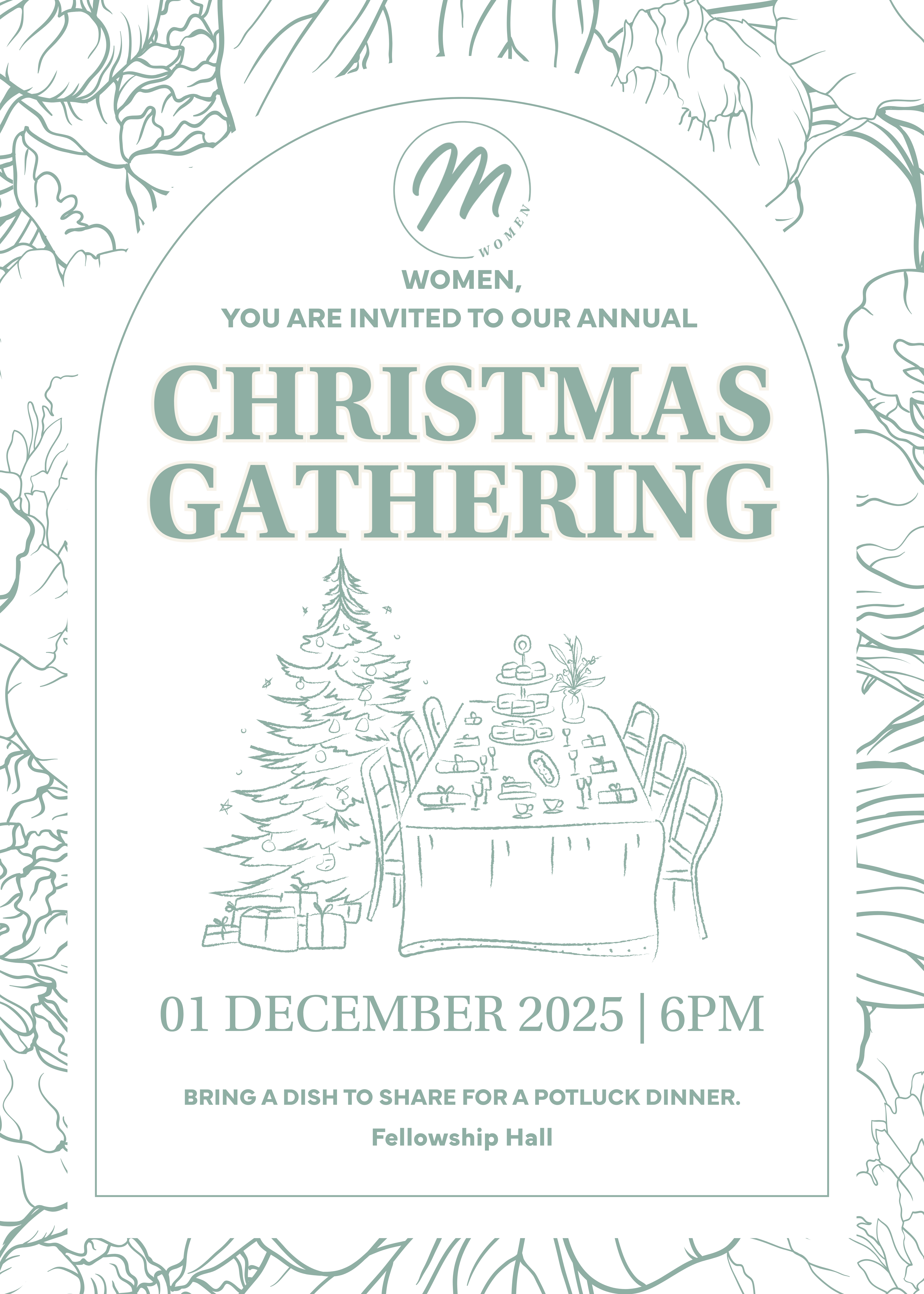 The women’s gathering is Monday, December 1 st, at 6:00PM in the Fellowship Hall. Food will be served and all ladies are invited. The meal is potluck style- bring your favorite dish!